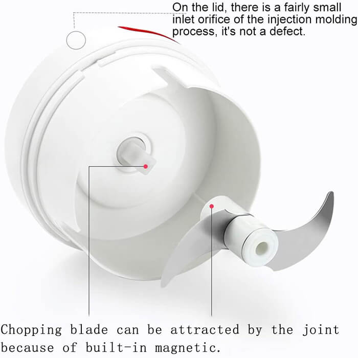 Easy to Clean: The bowl and the blades can be separated, so this hand held chopper is convenient to be washed. If water gets into the lid, reverse the lid, then pull the string, the remaining water will be out.