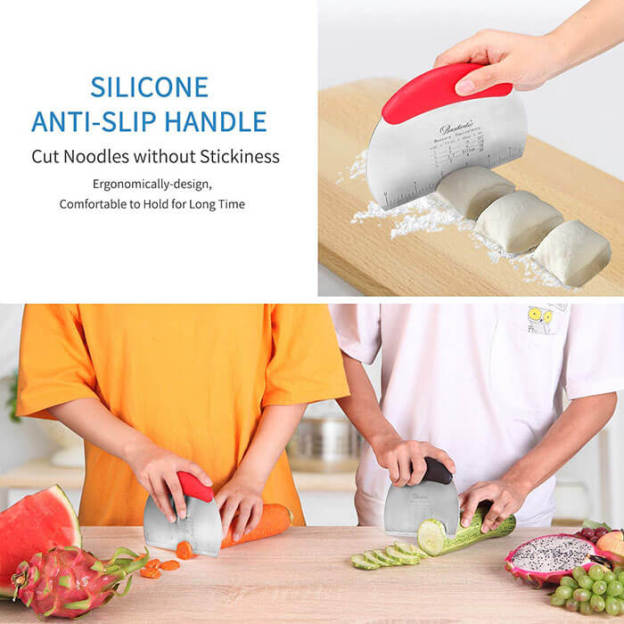 You can use this multi purpose bench scraper to chop veggies or scoop food in general, it is great to cut and separate large hunks of dough and for scraping the flour from the counter when cleaning up. Especially perfect for pastry cutting.